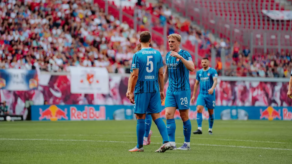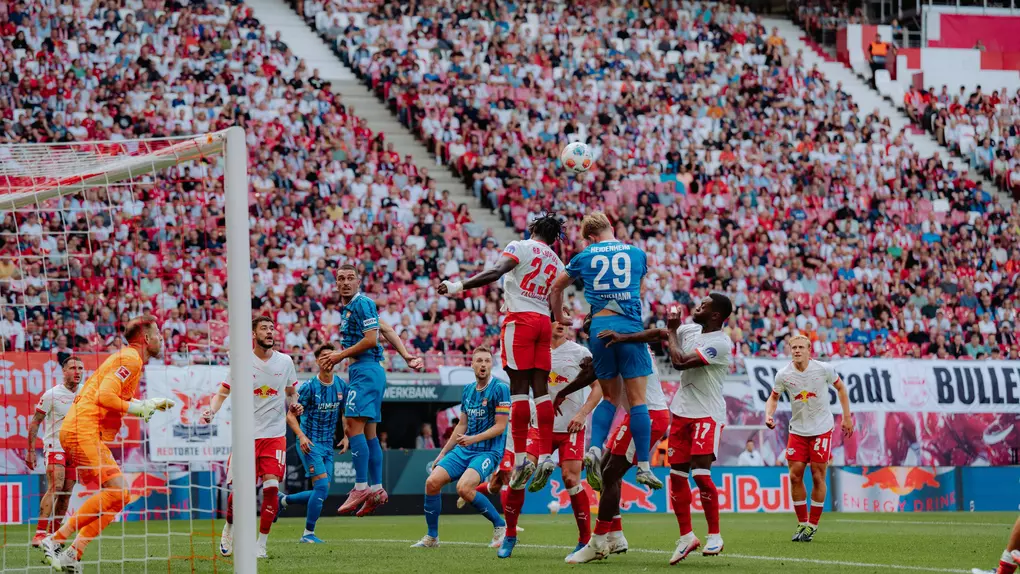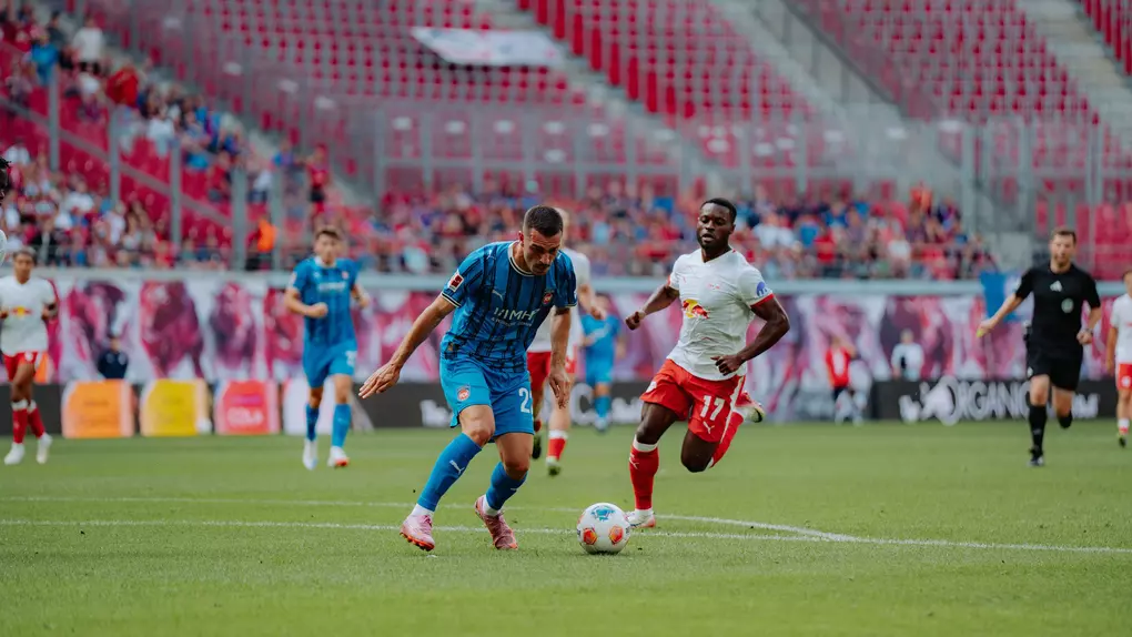 Los ging‘s in einer wilden Anfangsphase, vor 43.495 Zuschauern in der Red Bull-Arena, mit einer Schrecksekunde in der 5. Minute im Heidenheimer Strafraum, als Christoph Baumgartner heranrauschte und Niklas Dorsch im Spielaufbau den Ball weggrätschte – zum Glück knapp neben das Gehäuse. Auf der Gegenseite ließen die ersten Chancen der Rot-Blau-Weißen auch überhaupt nicht lange auf sich warten. Eine Flanke von Luca Keber nahm Mathias Honsak (8.) per gefährlicher Direktabnahme, ehe Arijon Ibrahimović bei der anschließenden Ecke die Kugel mit seinem Kopfball knapp über das Tor setzte.