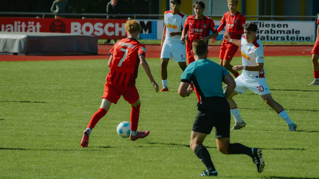 Von Beginn an waren die Heidenheimer hellwach, eroberten früh zahlreiche Bälle und zeigten sich sehr präsent in den zweiten Bällen. Bereits in der 4. Minute ging der FCH in Führung: Nach einem Abpraller eines direkten Freistoßes traf Philipp Weiß zum 1:0. Nur wenig später legte die FCH U17 nach – Luca Mayer erhöhte in der 15. Minute nach starker Vorarbeit von Noah Schneider auf 2:0. Nach etwa 25 Minuten wurde der FCH etwas zu passiv, wodurch Regensburg besser ins Spiel fand. In der 38. Minute gelang den Gästen folgerichtig der Anschlusstreffer zum 2:1. Kurz vor der Pause hatten die Heidenheimer zudem Glück, als der SSV zweimal am Aluminium scheiterte.