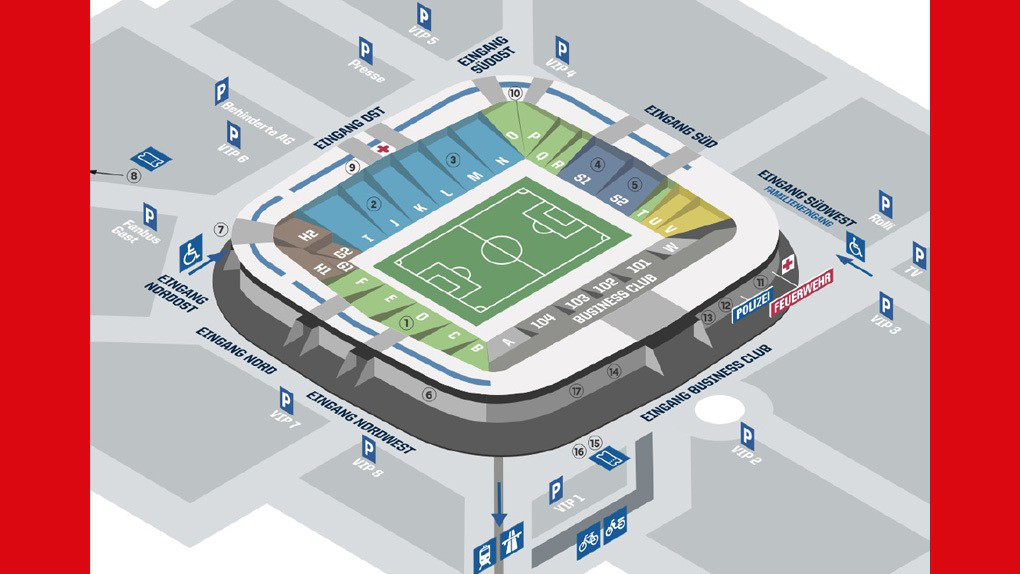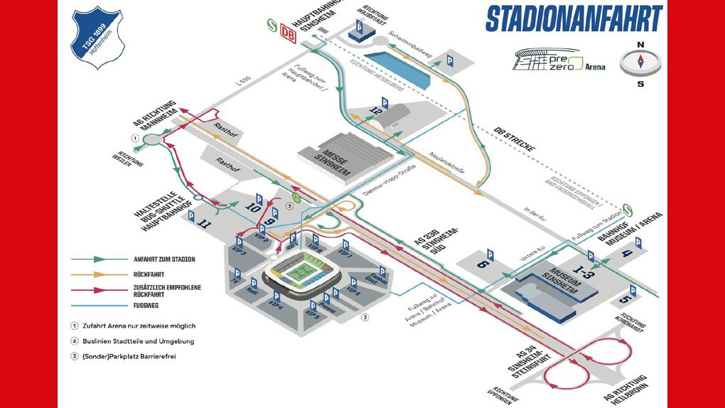 Zufahrt zu den Parkplätzen über die Zufahrt „P4-P8”. Der Zugang erfolgt über die Rampe „Eingang SÜDOST“. Dort nimmt das Team „Barrierefrei“ der TSG die entsprechenden Gästefans in Empfang.
