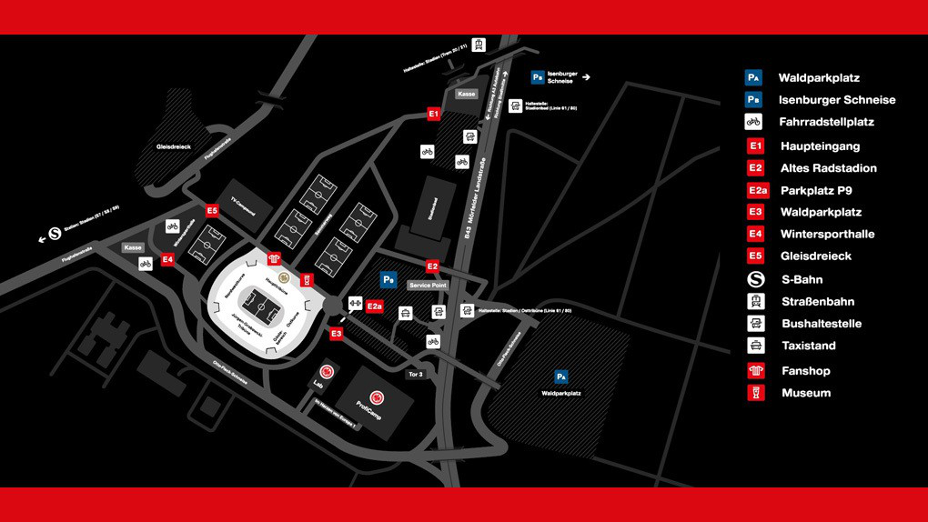 Die Anfahrt erfolgt aus allen Richtungen über die A3. An der Anschlussstelle Frankfurt-Süd auf die B44 Richtung Frankfurt-Stadtmitte/Stadion wechseln. Ab dort der Beschilderung zu den Stadionparkplätzen folgen.