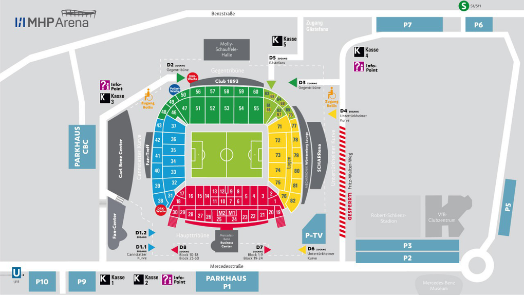 Der Zugang zur MHP Arena über die Mercedesstraße ist für Gästefans nicht geeignet. Solltet Ihr Euch aus dieser Richtung auf den Weg zum Stadion machen, dann bitte fußläufig die Benzstraße zum Gästeeingang nutzen.