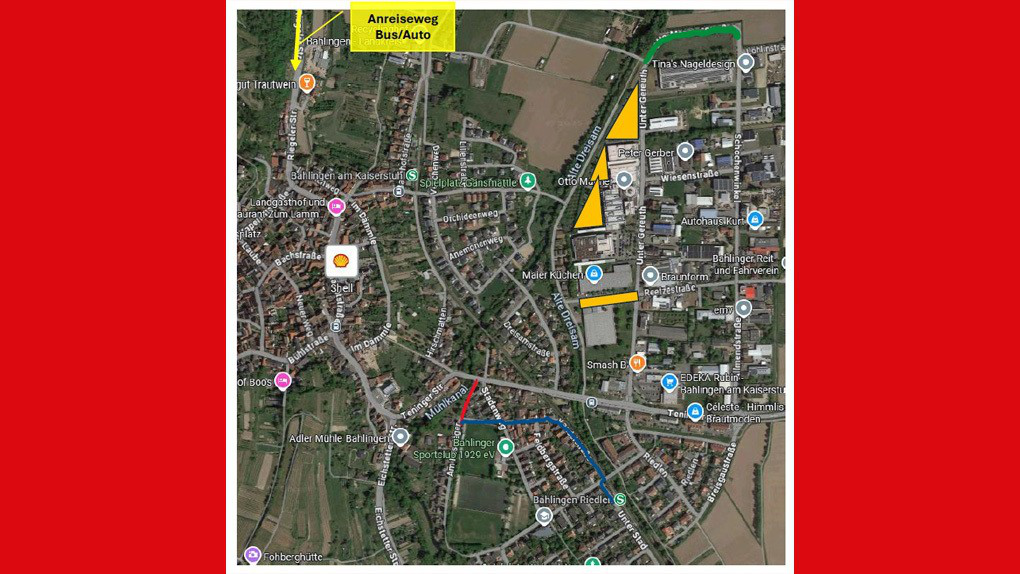 An der zweiten Fußgängerampel (Höhe “Teninger Straße 15”, siehe rote Linie auf dem Plan) wird der Bus von der Polizei kurz gestoppt, um die Fans aussteigen zu lassen. Die Fans können dann über den Fußgängerweg am Mühlkanal in Richtung Stadion laufen (2 Minuten Fußweg). Die Busse fahren weiter ins Industriegebiet, wo diese parken können (Otto-Männer-Straße, 79353 Bahlingen am Kaiserstuhl).