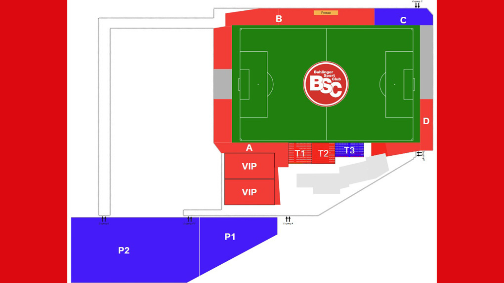 Der Gastbereich befindet sich in den Blöcken C und T3. Personen mit Tickets für den Block C nutzen den Zugang C. Personen mit Tickets für den Block T3 nutzen den Zugang A. Die jeweiligen Zugänge sind zudem auf dem Ticket (s. dort abgebildeter Stadion- / Blockplan) vermerkt.