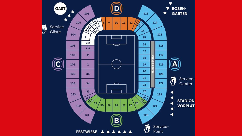 Der Gästebereich befindet sich in den Blöcken 3.2 (Sitzplätze) und 4 (Stehplätze).